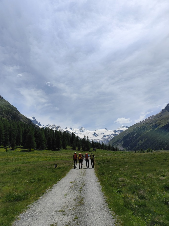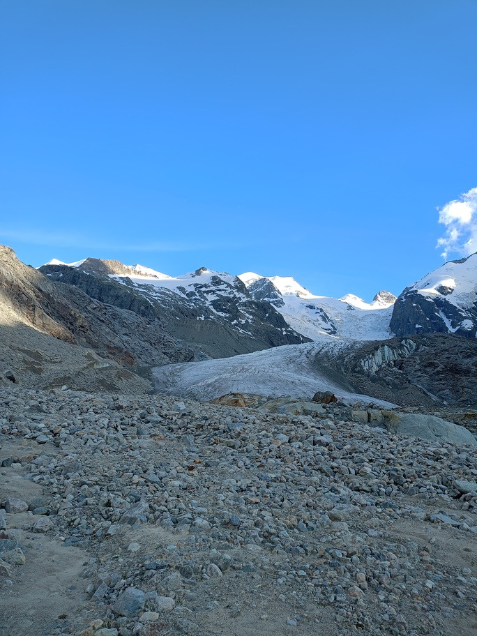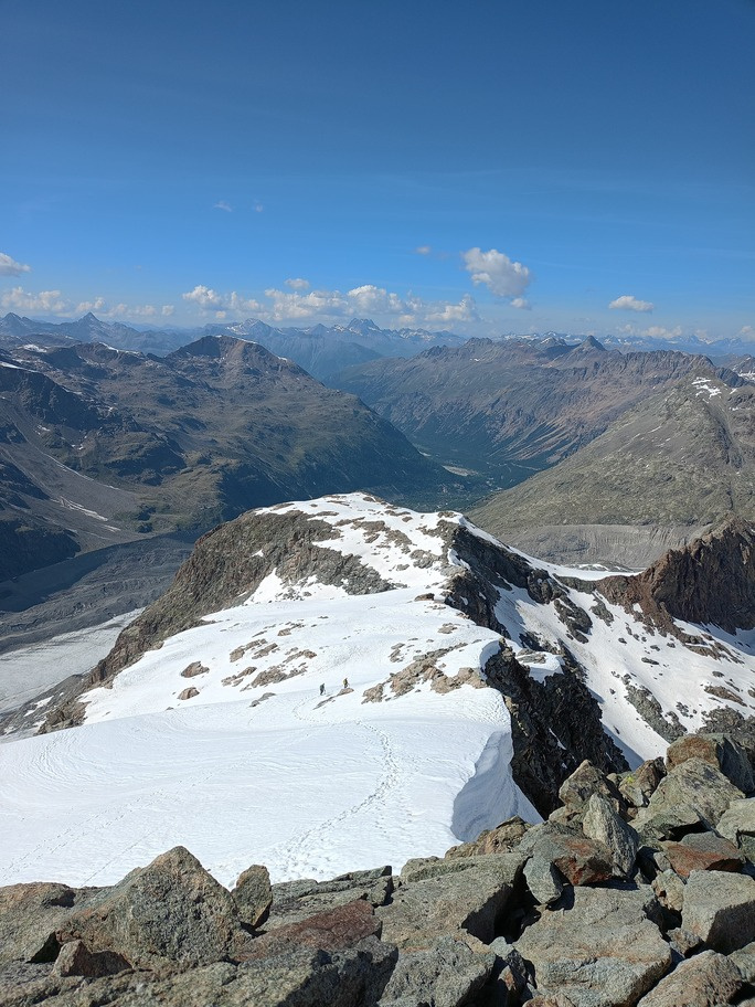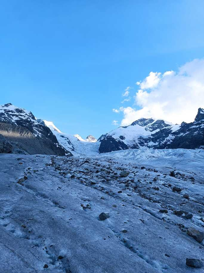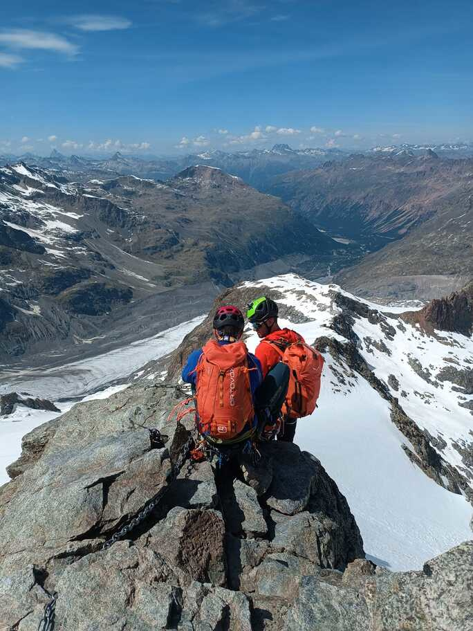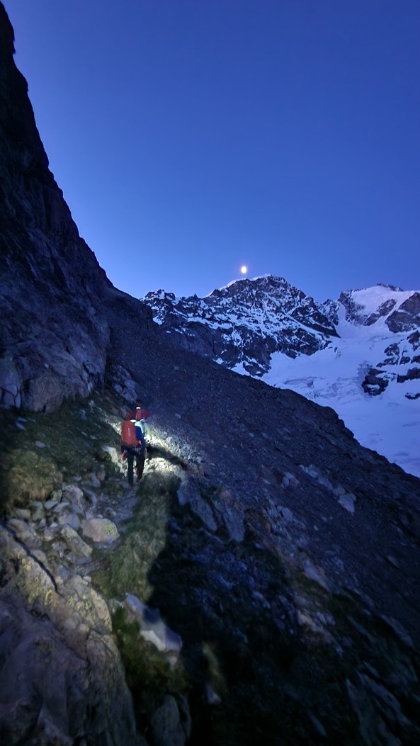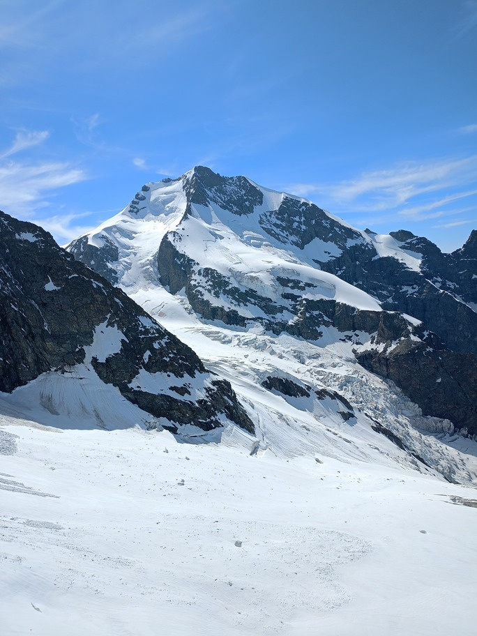 View route detailsHow nice summer is—it's hot, deadly hot, and the only way to survive is to go up into the high mountains! Ah no, I forgot… it’s actually spring. Anyway, in view of the upcoming aspirant course module, we decide to stretch our legs in the Engadin, where temperatures are considerably milder. After a little carriage ride—noblesse oblige—we head to the Tschierva hut, where a generous dinner awaits us. Just enough time to realize it’s already time for bed, and the alarm is already ringing… We set off across the moraine and quickly reach the Forcola Prievlusa (which I enjoy misnaming, given its rather unfortunate name). From there we calmly reach the summit, finding the route in excellent condition. Less fun is the descent from the “fortress” (not exactly well tracked), on very heavy, slushy snow. To top it all off, since we started like nobles, we return like nobles too—with a nice taxi ride back to the cars in Pontresina.