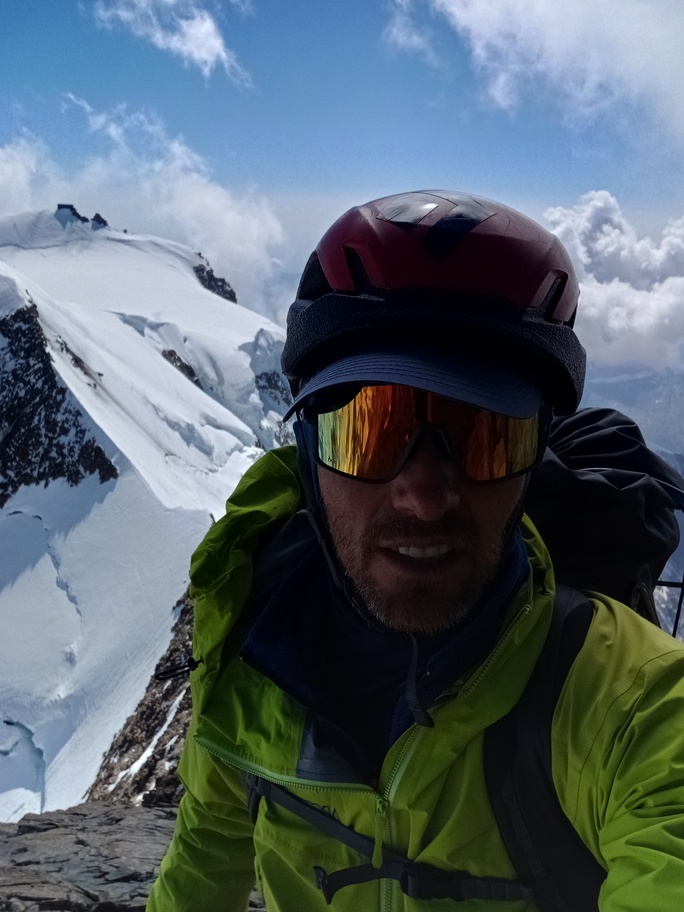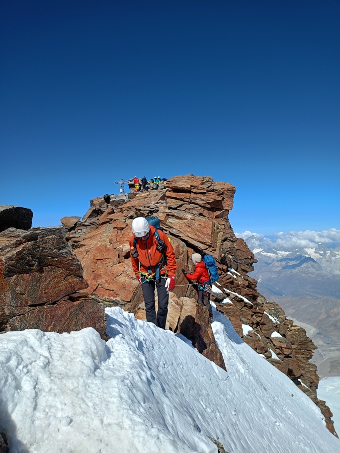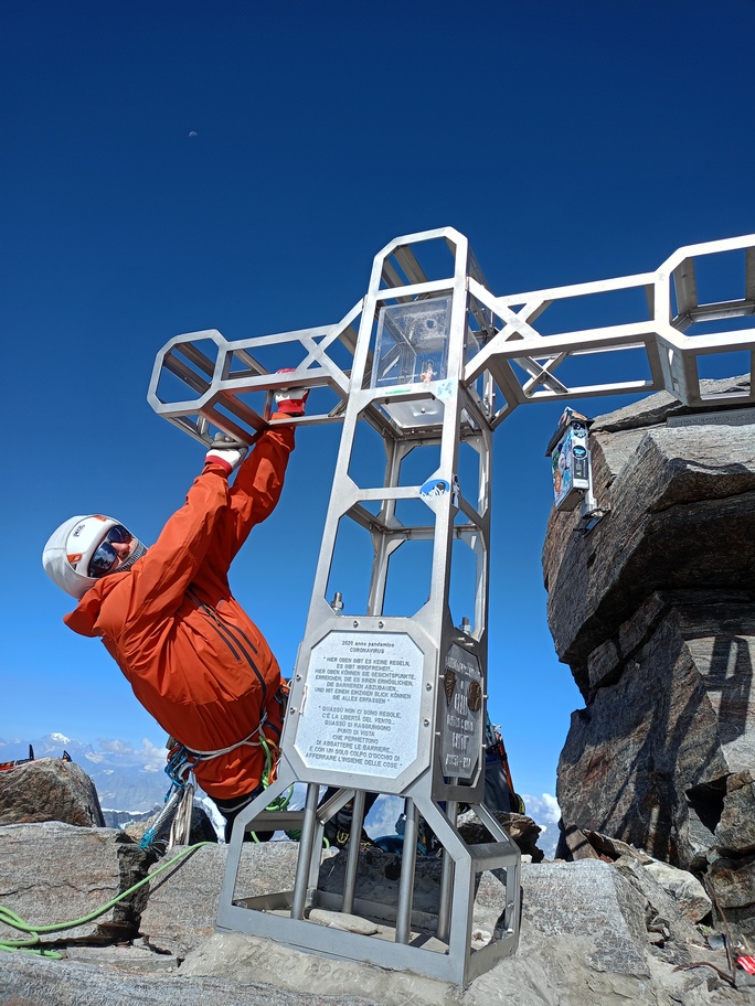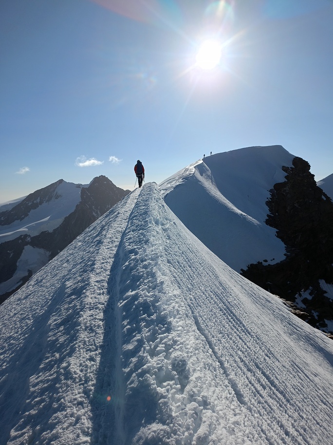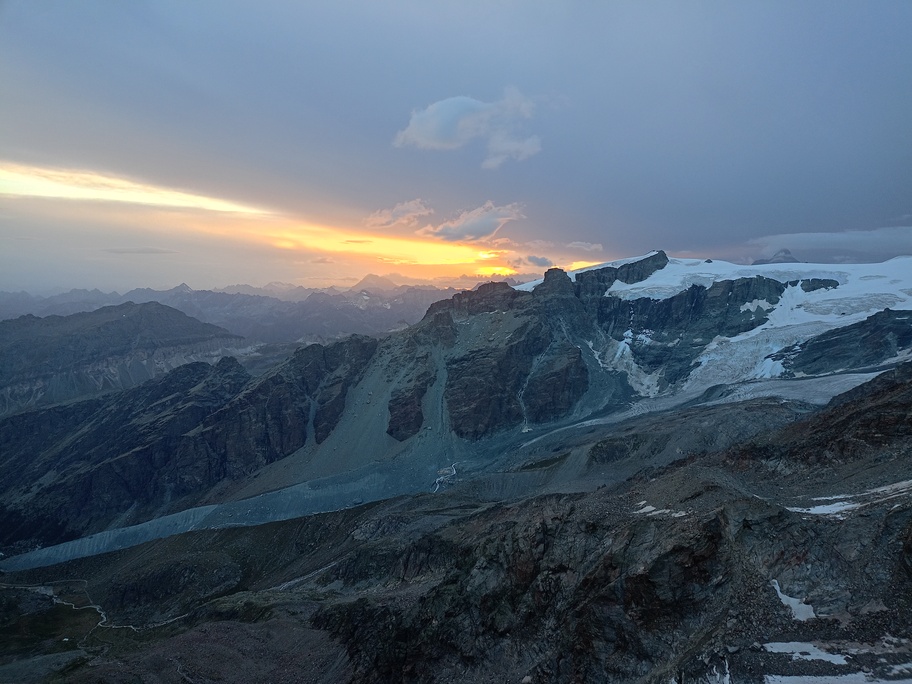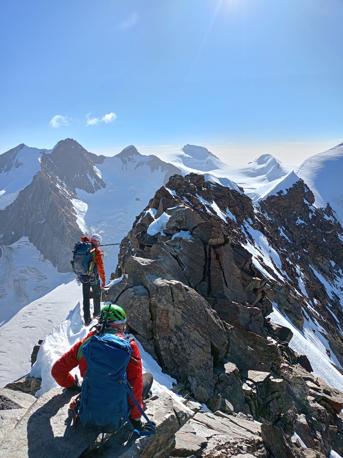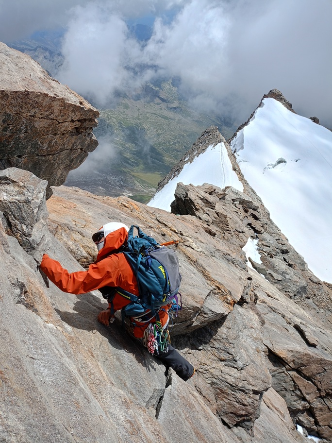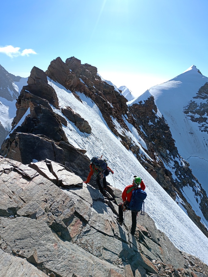 View route detailsIs there anything more fascinating than a rendezvous at the Balmenhorn? Perhaps a meeting at the Felik Pass… That’s how this next little segment of the journey with Teodoro begins. Bad weather prevented him from crossing the Lyskamm traverse, so when I call him I find out he’s at the Rossi e Volante hut instead of the Balmenhorn. Luckily, cable cars exist, so I buy a “grand tour” ticket and set off. At Pianalunga everything is still—then the perfect storm begins, with hail and lightning—but I get lucky. There are plenty of people needing to get back down to Gressoney, so as soon as the lightning stops, operations resume. In my mind I’m facing a five-hour walk to the Quintino Sella Hut, but by a hair’s breadth I manage to catch the penultimate cable car to Sant’Anna and then the gondolas. A beautiful night under the stars, and we set off. We are perfectly on time. Five minutes after I arrive at the Felik, I hear a shout: “Fre! We’re here!” I continue alone across the Lyskamm ridge—a rope team of three wouldn’t make sense here. When we reach the Balmenhorn, Enrico is tired and stays behind to melt snow and keep our spot for the evening. Teo and I climb a few surrounding peaks until our stomachs start rumbling more than usual, and we return to the bivouac, where we devour three packets of food, polenta, and a bar of chocolate. After a somewhat restless night, we set off again and climb the Parrot Peak, stopping for breakfast with a slice of pizza at the Capanna Margherita. After an hour’s break we get moving again and, at a very relaxed pace, catch up with the rope teams that had left two hours before us near the summit. I say goodbye to the guys heading down toward Zermatt, and three hours later I’m in Indren.